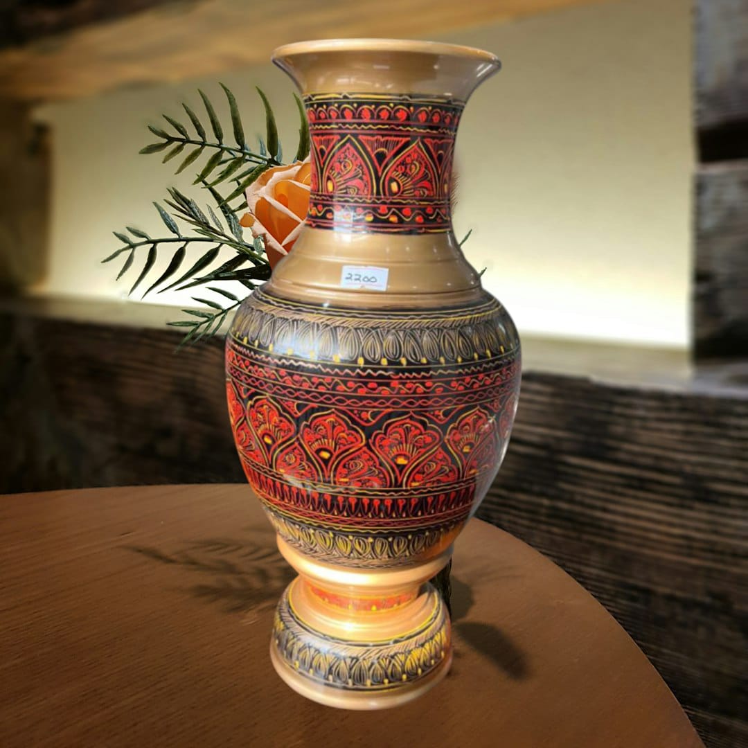 Each piece begins with carefully selected wood, shaped and smoothed to perfection before being adorned with delicate Naqshi motifs—often inspired by floral, paisley, or geometric themes. The hand-engraved patterns are then painted or stained by hand, making every vase a one-of-a-kind treasure.